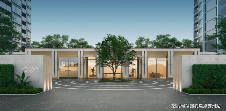 小区入口处,浅色系造型简洁又不失仪式感的景墙、环岛式的落客区,连缀归家大堂。
