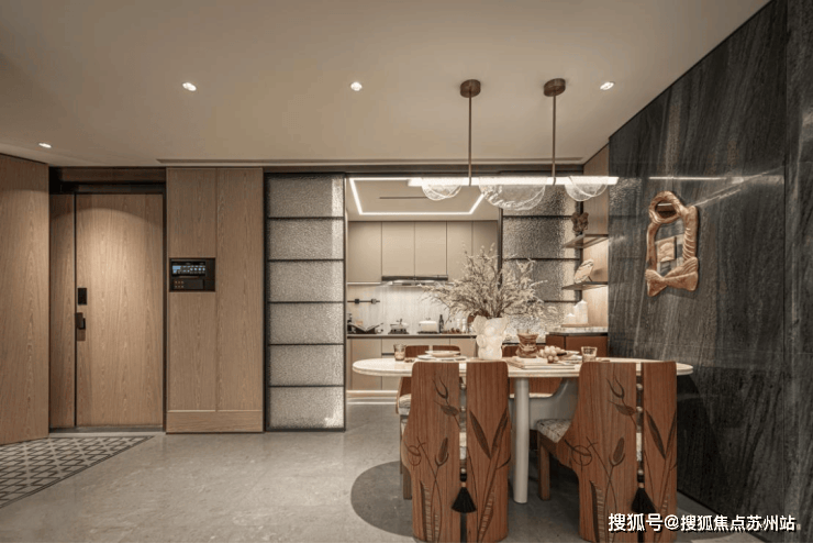 墙面,严选安第斯雪或晓山青珍贵石材,与木饰面、特色定制墙布组合设计;客厅、餐厅、卫生间等区域地面定制石材,赤足走过,温润细腻的触感。
