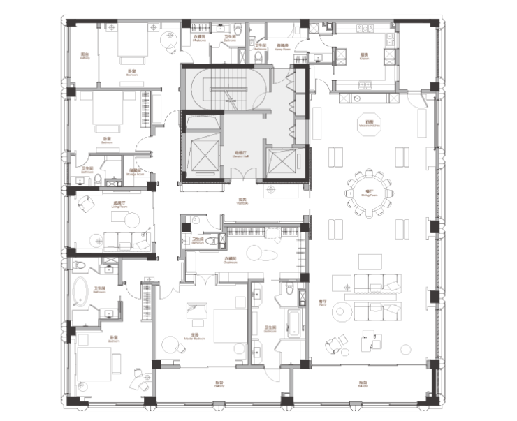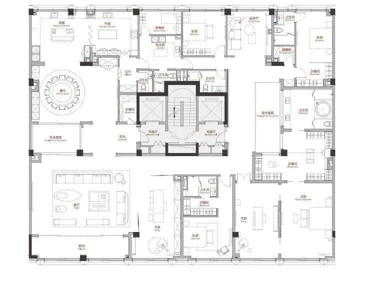 一期可售的户型面积集中在458-641㎡。当风貌平层户型尺度做到这个层面,其实户型本身已经无可挑剔了。仅说个细节,一期风貌平层中,做了罕见的做了两梯一户配置,主佣分离很好地保证了业主的隐私性和动线。