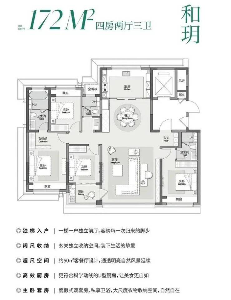 * **产品与规划**:占地约4万㎡,容积率**1.7**,建筑密度**19.8%**,规划**11栋13-17层的小高层**,无高低配。全部户型为**165㎡以上的四房大平层**,精装修交付。