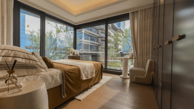 极致窗墙比的立面。由大面积的水晶玻璃包裹,并进一步融入珠宝雕刻工艺,回应项目钻石切割的设计母题,“正如它的slogan——“可居住的水晶宫殿”,赋予室内“无死角”超绝采光。