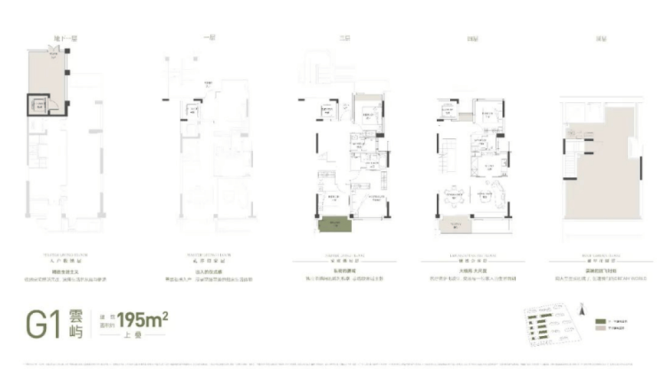 建面约215㎡上叠 : 屋面+庭院+地下室+ 露台+阳台的整体附赠空间约110㎡;
