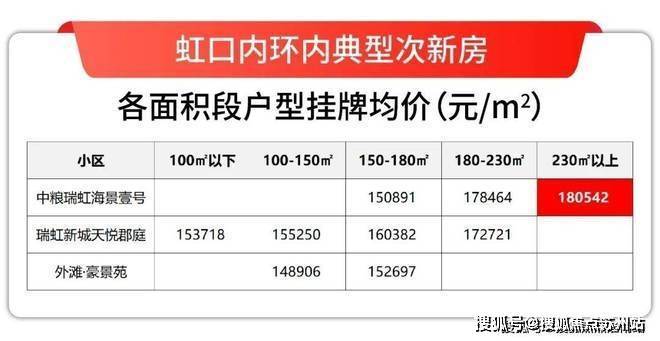 如果把虹口内环内几个典型次新房小区按面积段做细分,你会发现230㎡以上大户型的挂牌价超过18万/㎡,比150㎡以下户型普遍要溢价15%左右。