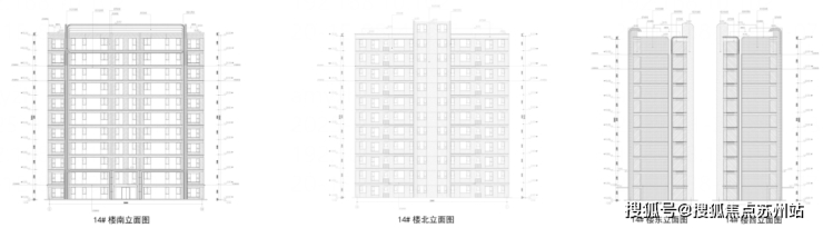14#立面图如下,层高 3.3米。立面材质由 米白色铝板+灰色铝板+墨绿色陶板+灰色铝板线条+银白色铝板组成。