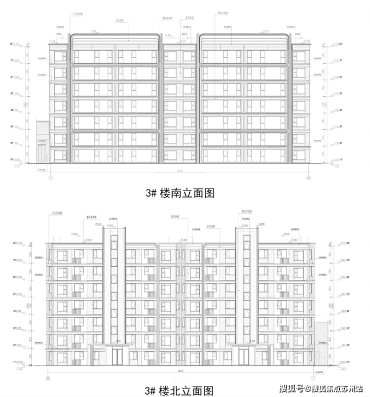 3#立面图如下,层高 3.1米。立面材质由 米白色铝板+灰色铝板+墨绿色陶板+灰色铝板线条+银白色铝板组成。