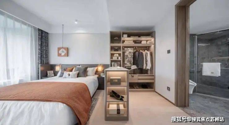 步入主卧,半隔的衣帽间将休憩空间与卫生间隔开,丰富了日常生活的动线,同时也彰显主人的尊贵和私密性。