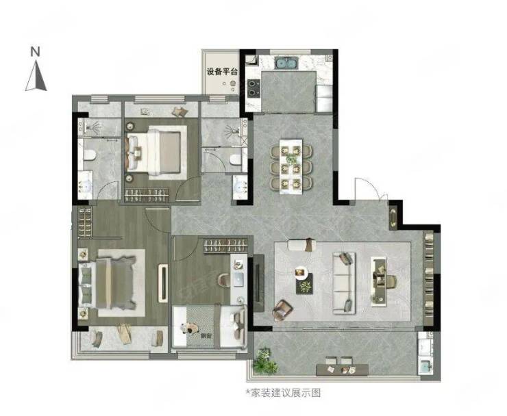 ● 约103㎡ 立峯户型:三房两厅两卫,全能高定样板,功能紧凑无浪费,是进驻狮山的高性价比之选。