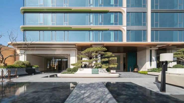 以杭州折扇为灵感而造的超尺度门庭,12片巴西进口百达翡绿玉石屏风,由非遗传承人朱炳仁团队打造的巨幅铜门,“玉镜流光”雕塑,大堂内八根巨幅立柱,还原了扇骨的形态,汝窑冰裂纹的陶片镶嵌,地面拼花运用江南花窗元素……