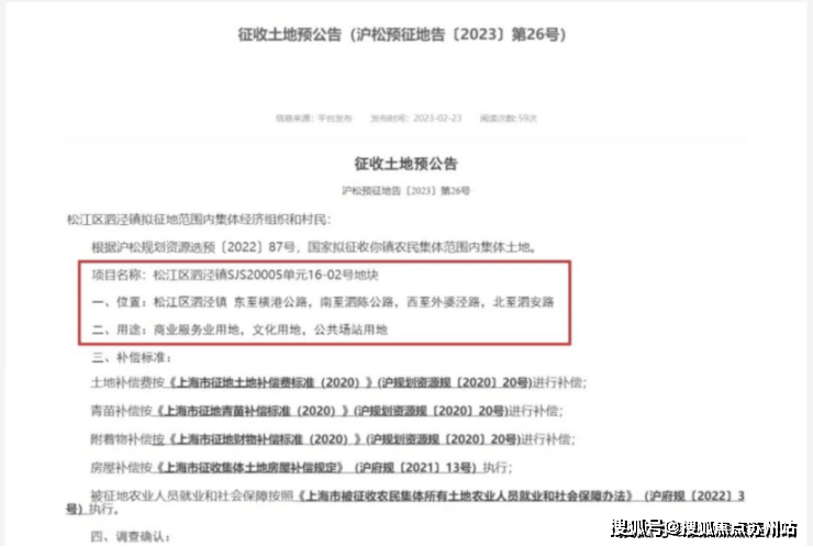今年2月23日,上海市松江区人民政府官方网站发布《泗泾镇SJS20005单元16-02号地块征收土地预公告》,该地块位于泗泾地铁站北侧,规划用途为商业服务业用地、文化用地、公共场站用地。