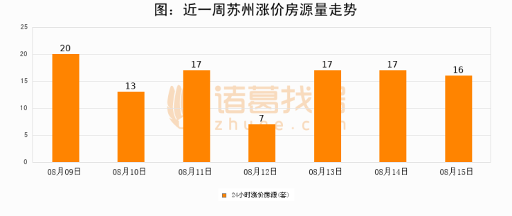 根据诸葛找房数据显示,苏州24小时涨价房源量为16套,较08月14日减少1套,环比下降5.9%。与此同时,涨价房源占比小幅回落,对于购房者来说是一个入市窗口期,购房者可抓住时机入市。