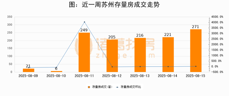 从存量房来看,2025年08月15日苏州存量房单日成交271套,比昨日增加50套,环比上涨22.6%。从近一周存量房成交来看,苏州存量房日均成交套数为169套,08月15日单日成交271套,高于近一周平均水平60.4%。