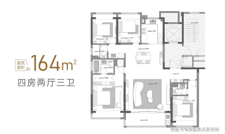 三居室户型:面积约164㎡,三室两厅两卫,适合三口之家或三代同堂。主卧带独立卫生间,私密性强;客厅与餐厅相连,空间开阔,采光良好。