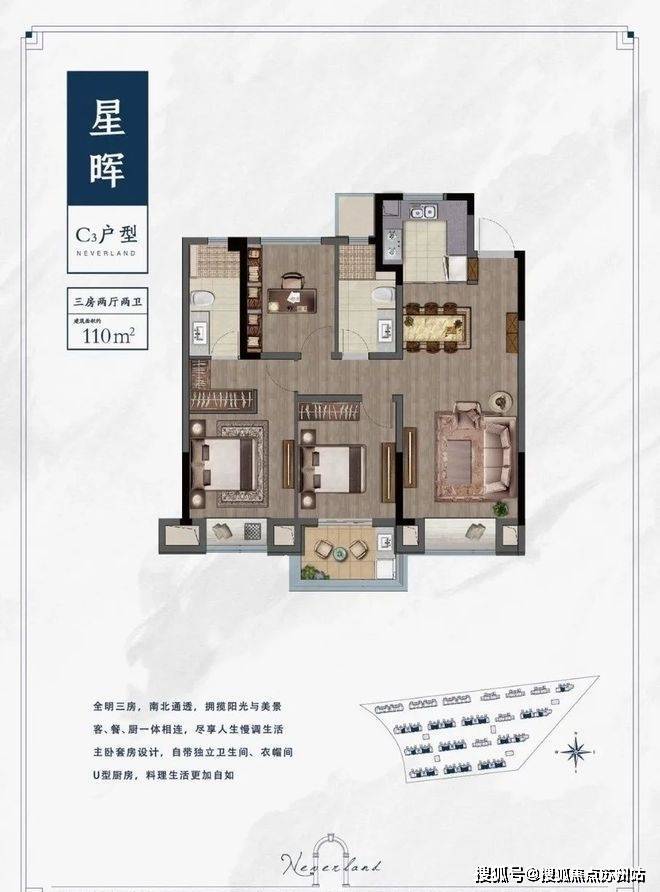 110㎡的三房两厅,相比上两个户型来的更为方正,三开间朝南,套房主卧带衣帽架,次卧难得拥有大阳台,采光效果可谓一流!