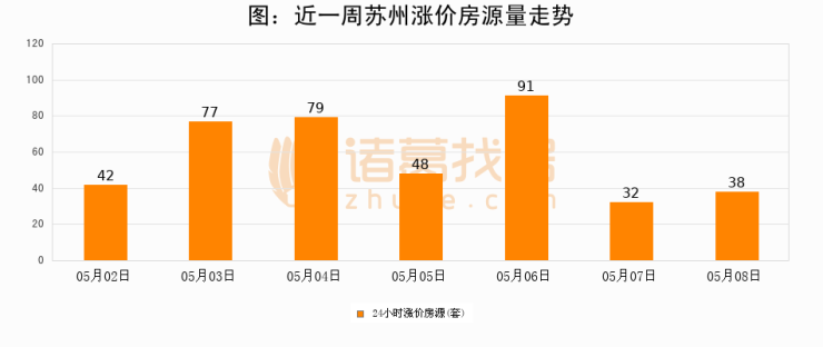 根据诸葛找房数据显示,苏州24小时涨价房源量为38套,较05月07日增加6套,环比上涨18.8%。与此同时,涨价房源占比小幅扩大,业主信心有所提升。