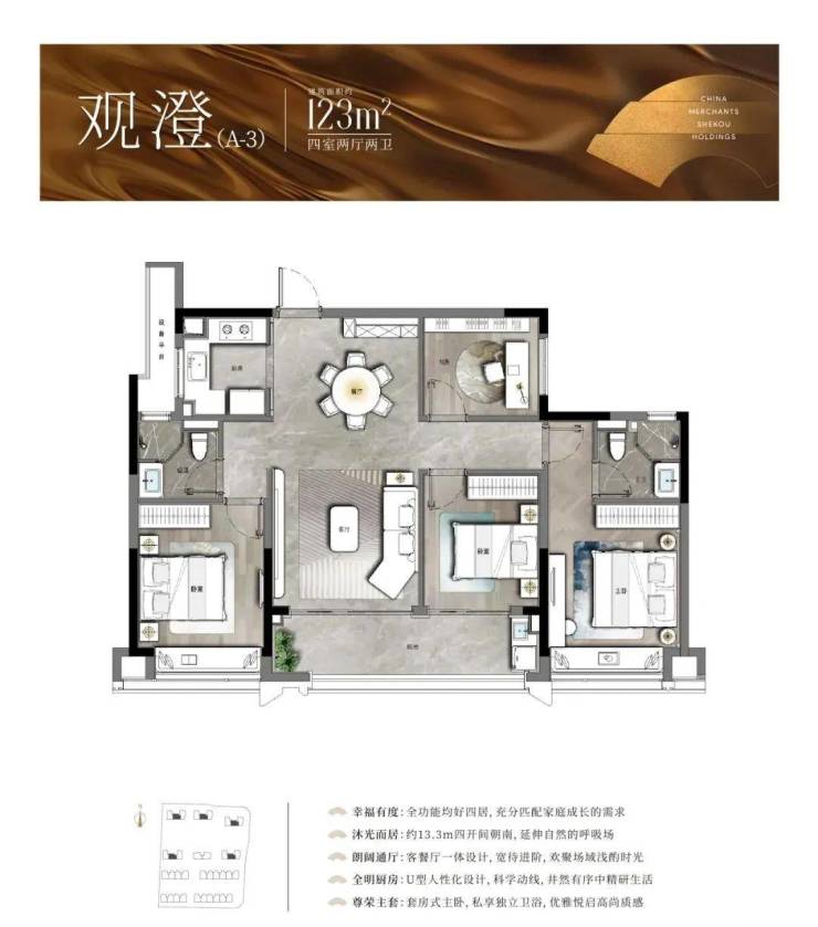 以中间套为例,建面约123㎡的户型做到了主次卧+客厅四开间朝南,伸展开约13.3米的超大面宽,对应双开间阳台与飘窗的设计,进一步提升了全屋的采光。此外,一体化的餐客厅,“一镜到底”活动空间,在视觉上拉大了户型的朗阔尺度。