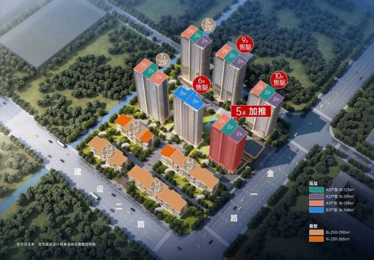 项目位于建设二路与金一路的交会处,依托方正的地形,规划了6幢高层+4幢叠排,其中高层住宅仅356套。户型方面,本次首开的2幢高层(9、10号楼),主推建面约123㎡的中间套,以及建面约129㎡、139㎡的边套,均为四房两厅两卫全明格局。