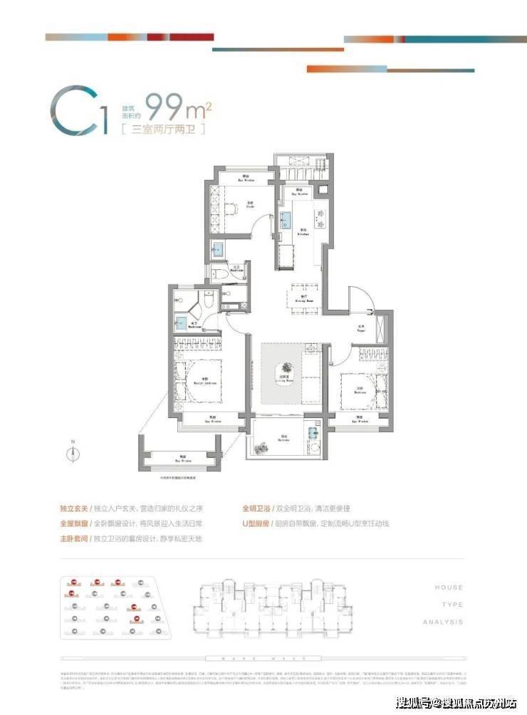 特别值得一提的是,建面约99㎡还做到了独立玄关+双卫配置,大大提升了业主的私密感