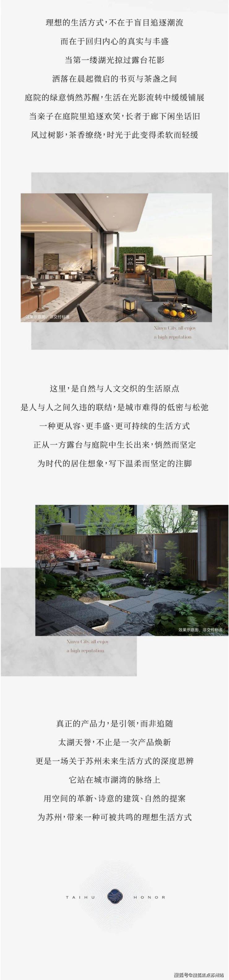 本项目推广名“太湖天誉”(备案名:天誉林涛雅居),开发商:苏州屿鑫房地产开发有限公司。本宣传资料仅为要约邀请,本宣传资料作为项目介绍,相关图文、数据、文字仅供参考。买卖双方权利义务均以《商品房买卖合同》及其补充协议的约定及政府相关部门的批文为准。本宣传资料对项目周边环境、交通、教育、商业及其他配套设施的介绍,均源于资料发布时的政府规划,旨在提供相关信息,不意味着本公司对此做出了承诺,最终以相关政府部门公告及周边现状为准。在法律允许范围内,本公司保留对本宣传资料修改的权利,敬请留意最新资料,本资料制作日期为2025年6月,有效期3个月。