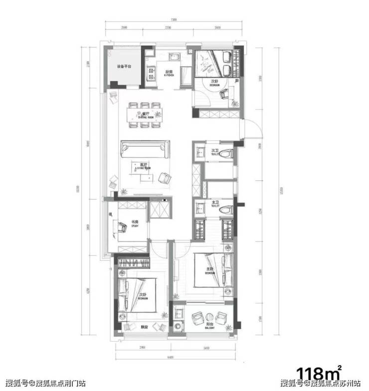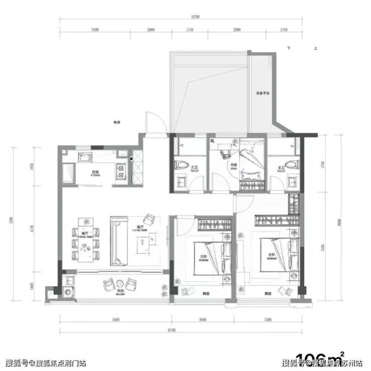 ➤➤建面约106㎡户型动静分区,在经典三房的基础上做了升级,四开间朝南(主卧、次卧、餐客厅朝南),南向面宽达到约11.7米