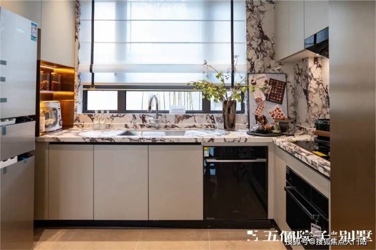 厨房U型操作台面,操作便捷,并预留了双开门冰箱位置.