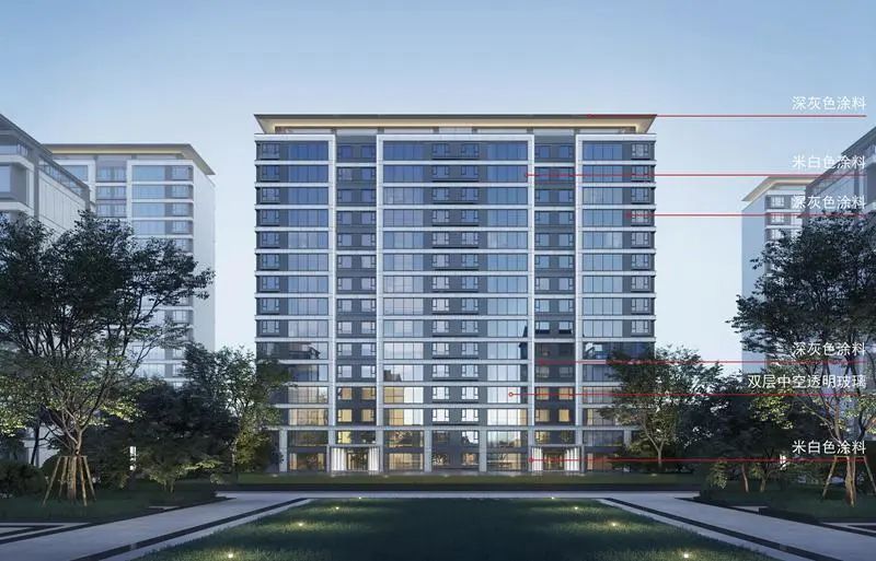 小高层与高层外立面采用米白色真石漆 + 浅灰色高级涂料 + 双层中空透明玻璃修饰,南向窗墙比超 40%,小区总体是现代东方建筑风格,简约大气。