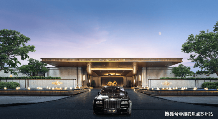 项目复刻半岛酒店的车马院,打造酒店式社区归家玄关,门头高约6.3米,大门尺度近百米,采用昂贵材质,彰显尊贵大家风范。