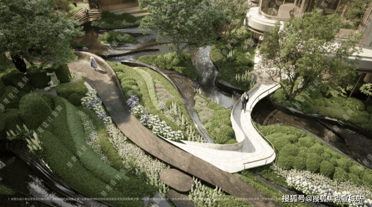 在全域抬板约4米的基础上,项目又下挖,形成罕见垂直落差。依托这一独特地形,项目打造“沿街古树花园+板上浮空花园+板下流石花园”的多层立体景观体系。