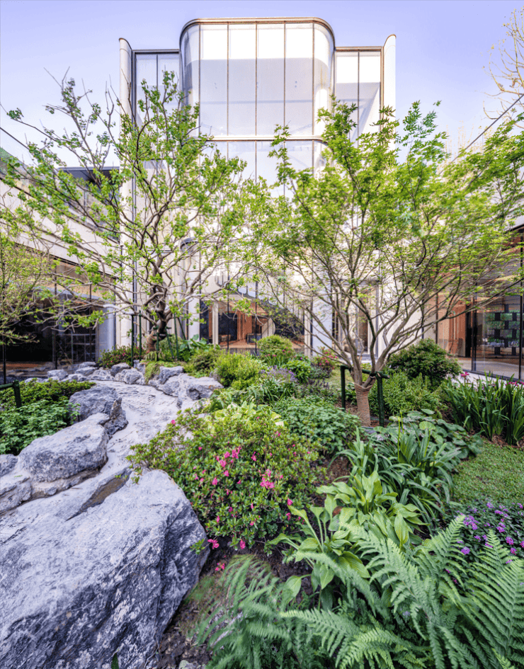 招商臻境循迹上海洋楼花园的种植方式,借由现代艺术化的语境构筑园内空间,将海派人文与静奢式酒店日常融入社区景观,以“海派腔调,静奢生活”的设计理念,打造“七维、六巷”的景观分布形制,演绎静奢式园林生活方式。