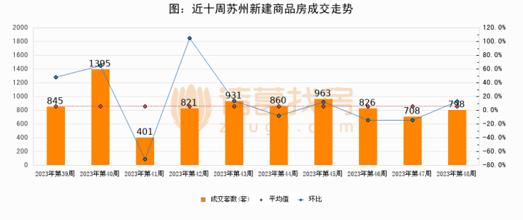 进入2023年第48周(11月20日-11月26日),苏州新建商品房成交798套,较上周增加90套,环比上涨12.7%