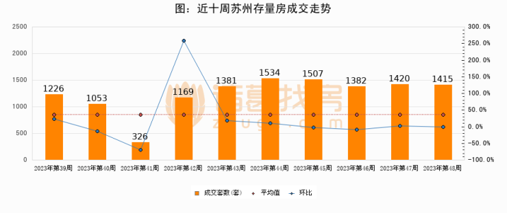 存量房方面,第48周苏州存量房成交1415套,较上周减少5套,环比下降0.4%。从近十周成交走势来看,周均成交套数为1241套,本周高于平均水平14%。