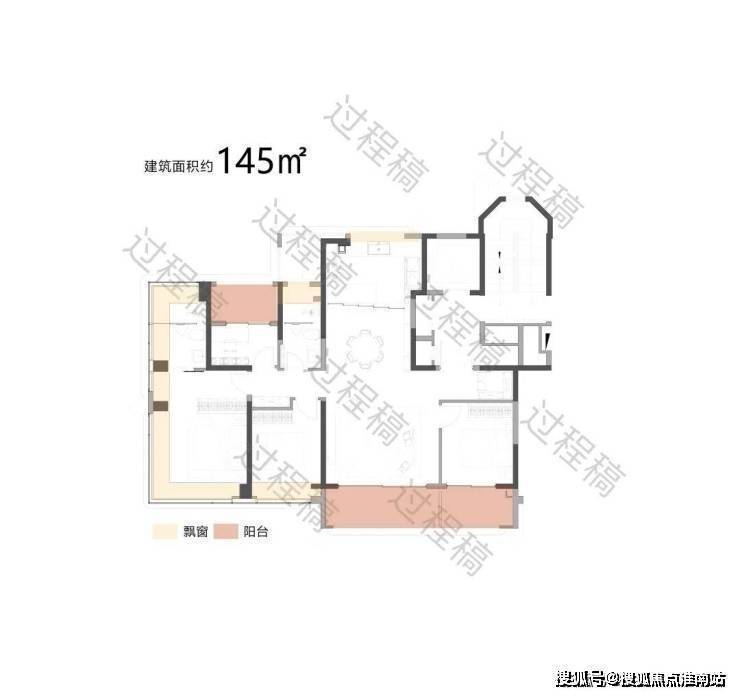 户型配备大面积飘窗(浅米色区域)和阳台(浅粉色区域),飘窗可引入柔和的自然光线,提升卧室等空间的明亮度;阳台则进一步拓展了采光面,同时有利于空气流通,保障室内通风效果,让空间更显通透舒适.
