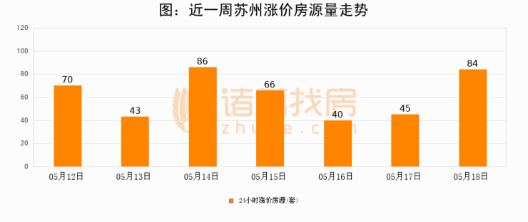根据诸葛找房数据显示,苏州24小时涨价房源量为84套,较05月17日增加39套,环比上涨86.7%。与此同时,涨价房源占比小幅扩大,业主信心有所提升。