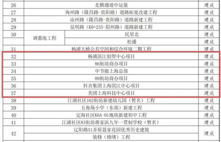 这份来自杨浦区官方公示的项目清单,清晰标注了从“新开工”“在建”到“建成”的全周期进度。其中,抖音、美团、滨江创智中心的全面建成,将杨浦滨江的发展确定性,从蓝图实实在在落地为实景。