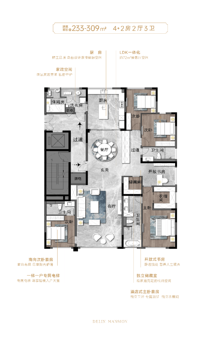 德邻公寓的建筑面积约233-309㎡奢阔平层大宅,采用4+2房2厅3卫的格局,重新定义高端人居标准。每户都有独立精装入户大堂与专属电梯,归家尊贵感十足。约72㎡的客厅、餐厅一体化空间,通透宽敞,适合举办名流雅集。南向双套房设计既保持亲密又尊重独立,保姆房/家政间让生活更加便捷,开放式书房营造人文意境,独立储藏室收纳生活美学,三分离卫浴与双衣帽间设计让品质渗透每个角落。