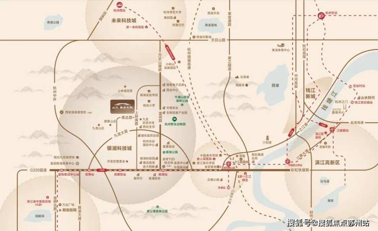 项目位于银湖科技城融杭门户,抢占交通资源高地,约1500米连接杭州地铁6号线虎啸杏站,瞬达杭州主城核芯。毗邻G320国道与彩虹快速路西延段,形成快速融杭交通走廊。