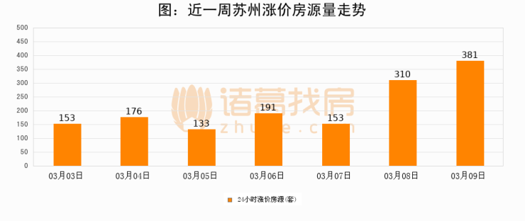 根据诸葛找房数据显示,苏州24小时涨价房源量为381套,较03月08日增加71套,环比上涨22.9%。与此同时,涨价房源占比小幅扩大,业主信心有所提升。