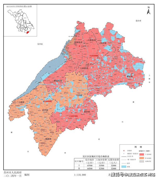 吴江区划定为两个区片,区片Ⅰ执行标准为65500元/亩,其中土地补偿费33500元/亩,安置补助费32000元/人;区片Ⅱ执行标准为64500元/亩,其中土地补偿费32500元/亩,安置补助费32000元/人。