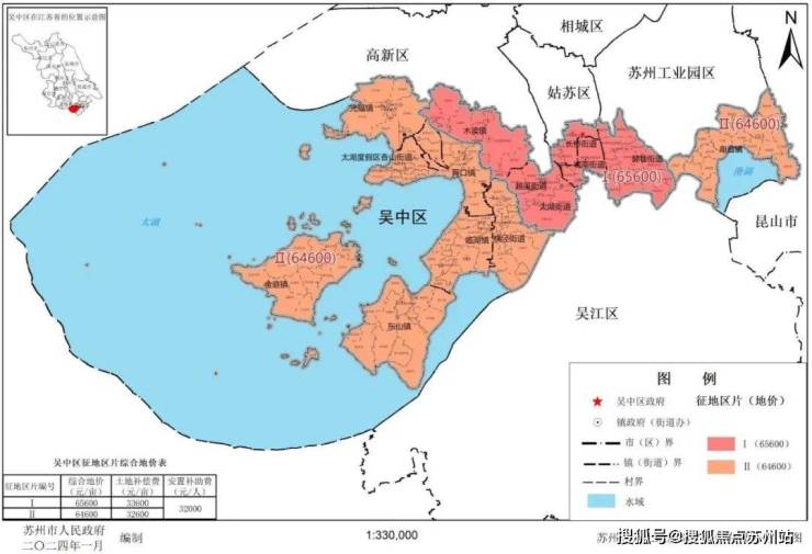 吴中区、相城区和虎丘区分别划定为两个区片,区片Ⅰ执行标准为65600元/亩,其中土地补偿费33600元/亩,安置补助费32000元/人;区片Ⅱ执行标准为64600元/亩,其中土地补偿费32600元/亩,安置补助费32000元/人。