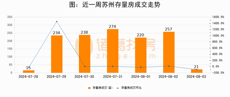 从存量房来看,2024年08月03日苏州存量房单日成交21套,比昨日减少236套,环比下降91.8%。从近一周存量房成交来看,苏州存量房日均成交套数为179套,08月03日单日成交21套,低于近一周平均水平88.3%。