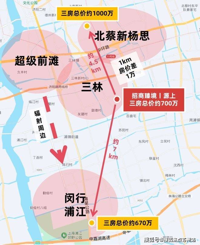 而往南面看,直线距离约7km的闵行浦江, 招商臻境售楼处电话:400-8787-554最新新房单价也要约6万/㎡,这里想买三房同样不容易,以闵行新房的边套107㎡面积为例,总价也已经