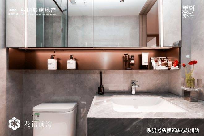 全屋墙布交付,甚至连局部免漆木饰面格栅+仿大理石岩板也是交付标准,诚意之高见微知著。在卫生间,主卧镜柜内置美妆冰箱,方便女主人储物各种面膜,化妆品等物件。客卫镜柜内置插座,可以给电动牙刷、剃须刀充电,吹头发也不用扯长长的电线。高规格居家从每一处体现得淋漓尽致。