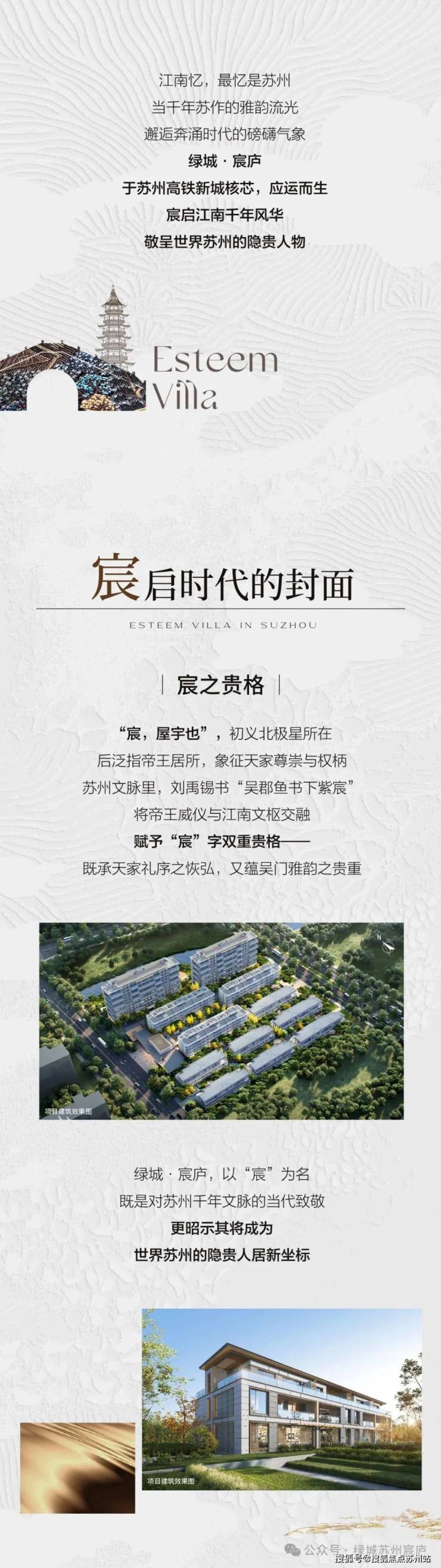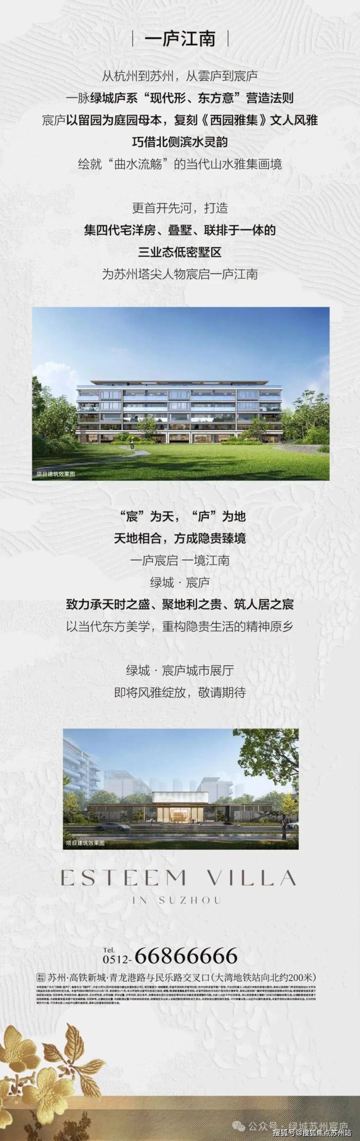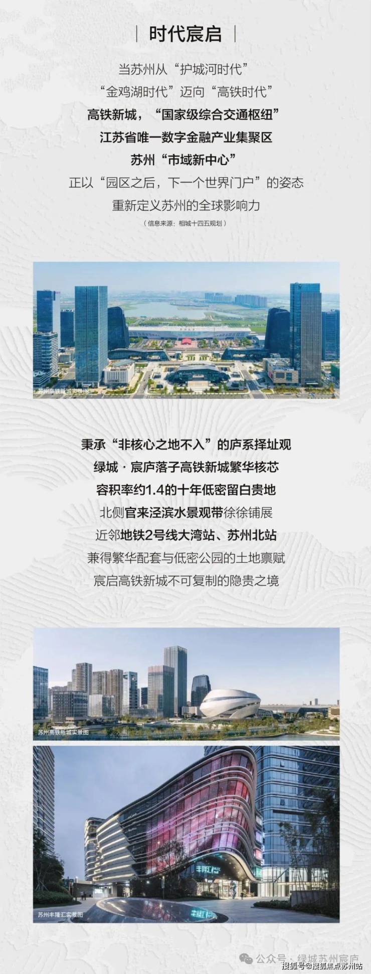 本项目推广名为“【绿城·宸庐】”,备案名为“【锦庐】”,开发公司为【苏州宏相城市建设发展有限公司】;受托管理方:绿城管理;本宣传资料所涉宣传内容,仅作为项目宣传推广使用,不在任何意义上构成开发商的承诺与要约,具体以政府部门审定的规划设计文件及《商品房买卖合同》的约定为准。 本宣传资料印制时间为2025年7月,有效期为1个月,本公司有权对宣传内容进行修改、调整,敬请留意最新宣传资料。本宣传资料所涉及的户型仅供示意参考,具体以政府部门最终审定的图纸和销售合同为准。教育配套信息来源于政府相关规划,仅供参考。学校的名称、建成时间、开办学性质、办学规模、学位设置、开学时间、招生条件、收费标准及招生区域划定等均存在未确定或者调整的可能,出卖人对此不作任何承诺,须以政府教育主管部门及校方的最新政策为准。交通配套信息来源于规划局数据,市政配套信息来源于规划局数据,仅供参考。交通规划设置、市政配套设置不排除因政府规划、政策规定及出卖人未能控制的原因而发生变化,本资料旨在提供相关信息,不代表着出卖人对此作出要约或承诺。本宣传资料对商业的具体业态、开业时间等仅作介绍,不代表出卖人对此作出要约或承诺,具体以经营者实际经营为准。