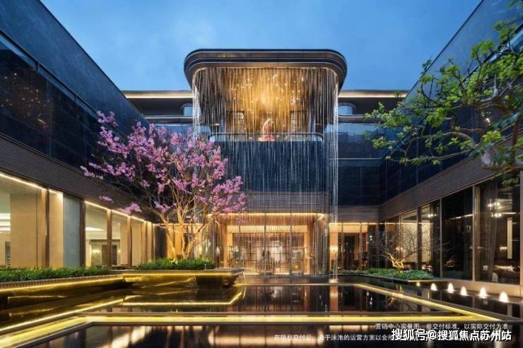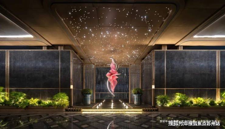 下沉式环幕庭院,跌水景观环绕,池底仿黑金砂与宝石晶片闪烁,点缀百余灯珠,师法“琉璃水光”形意,糅合视听五感,打造全浸式立体园境,天工巧夺,嘉定未见。