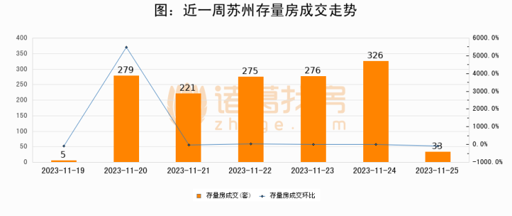 从存量房来看,2023年11月25日苏州存量房单日成交33套,比昨日减少293套,环比下降89.9%。从近一周存量房成交来看,苏州存量房日均成交套数为202套,11月25日单日成交33套,低于近一周平均水平83.7%。