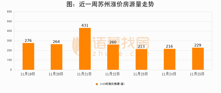 根据诸葛找房数据显示,苏州24小时涨价房源量为229套,较11月24日增加13套,环比上涨6%。与此同时,涨价房源占比小幅扩大,业主信心有所提升。