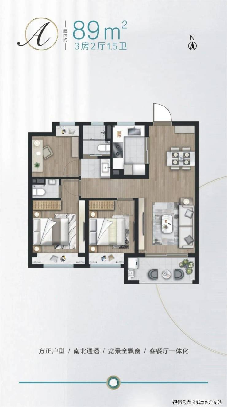 建面约89㎡3房,户型方正,三开间朝南.餐客厅一体,连通阳台,采光通风俱佳.全卧飘窗,主卧套房设计,提升了舒适度.1.5卫设计更加人性化,便于使用.