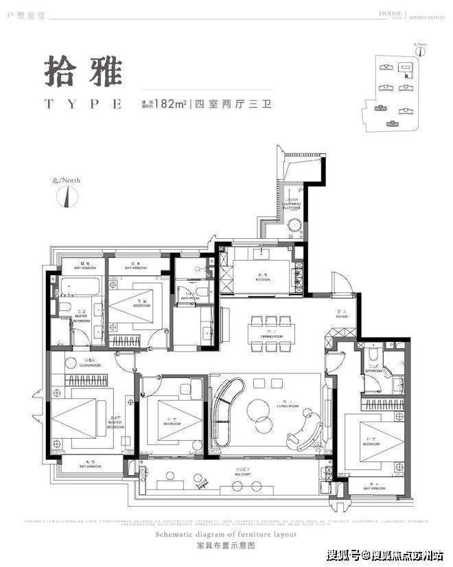 建面约182㎡户型,同样四房两厅三卫,更加注重居家生活的社交,凸显每个功能空间的均好性。