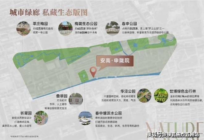 项目周边有多个生态公园约60万方的梅陇生态公园、约35万方的春申公园、约12万方的莘庄梅园以及春申塘滨水公园等等,生态宜居属性拉满!