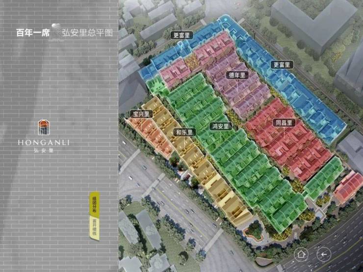 弘安里这块地原由8个街坊组成,其中东寿坊和永安里因后期加建改建较大,体量也很小,为了园区整体考虑,不再保留, 延续了剩余6个组团:德年里、和乐里、宝兴里、更富里和鸿安里。
