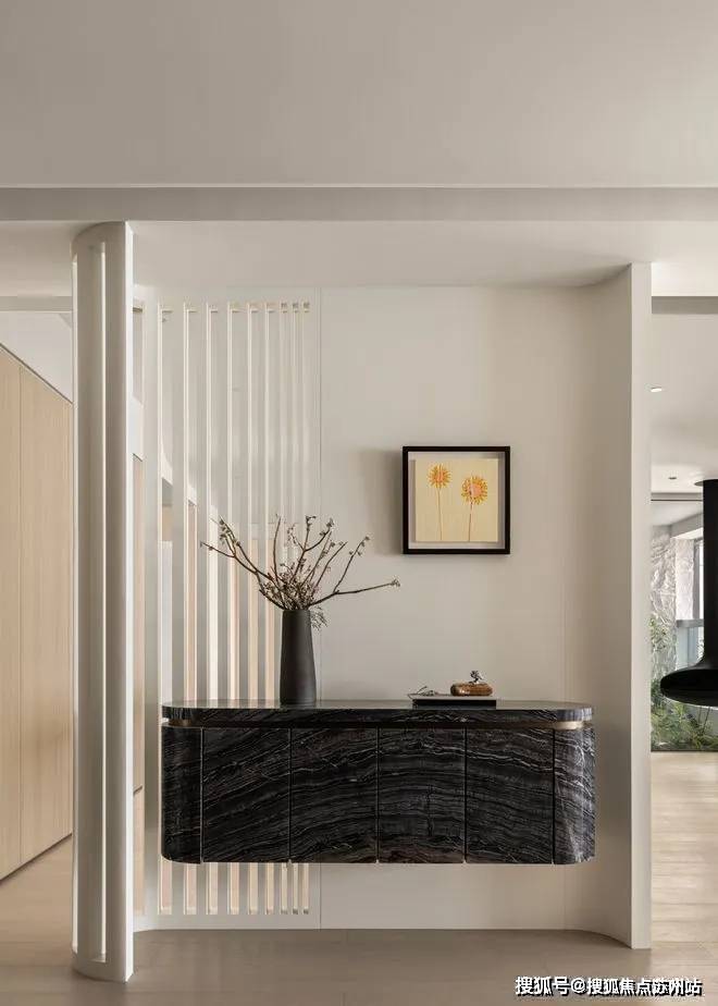 改变原结构无玄关的局面,塑造异形隔断,借由轻盈的悬浮造型与古木纹大理石台面形成对比,掀起第一轮视觉惊喜。渐变式格栅,造就出场域的音乐性,花艺与装饰画的意蕴高度契合,表述了居住者的生活态度和追求。